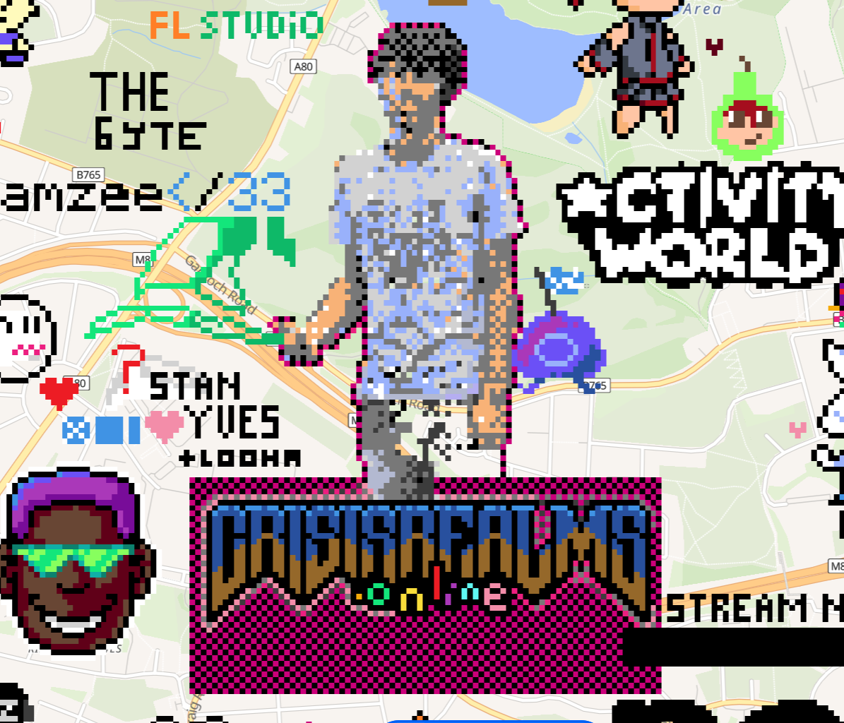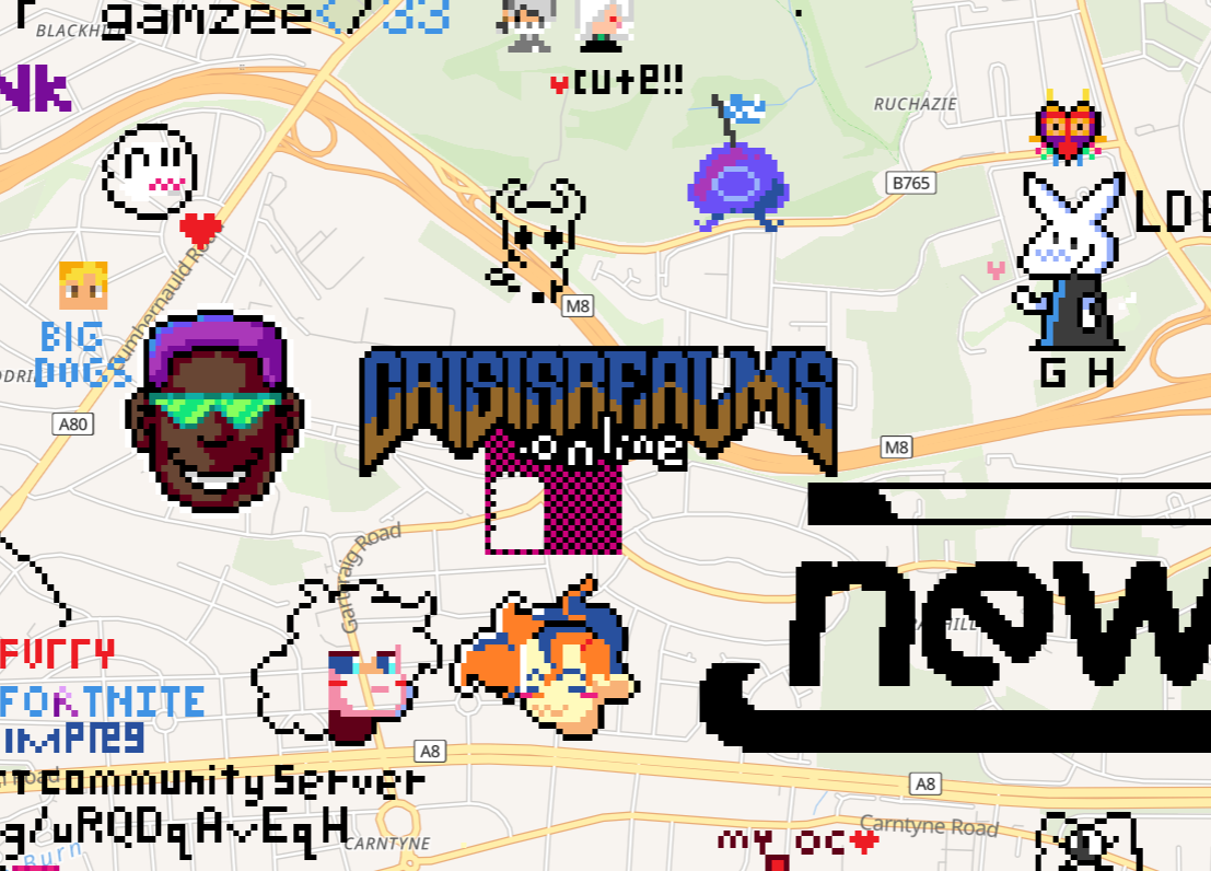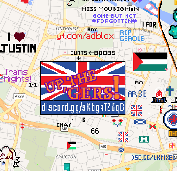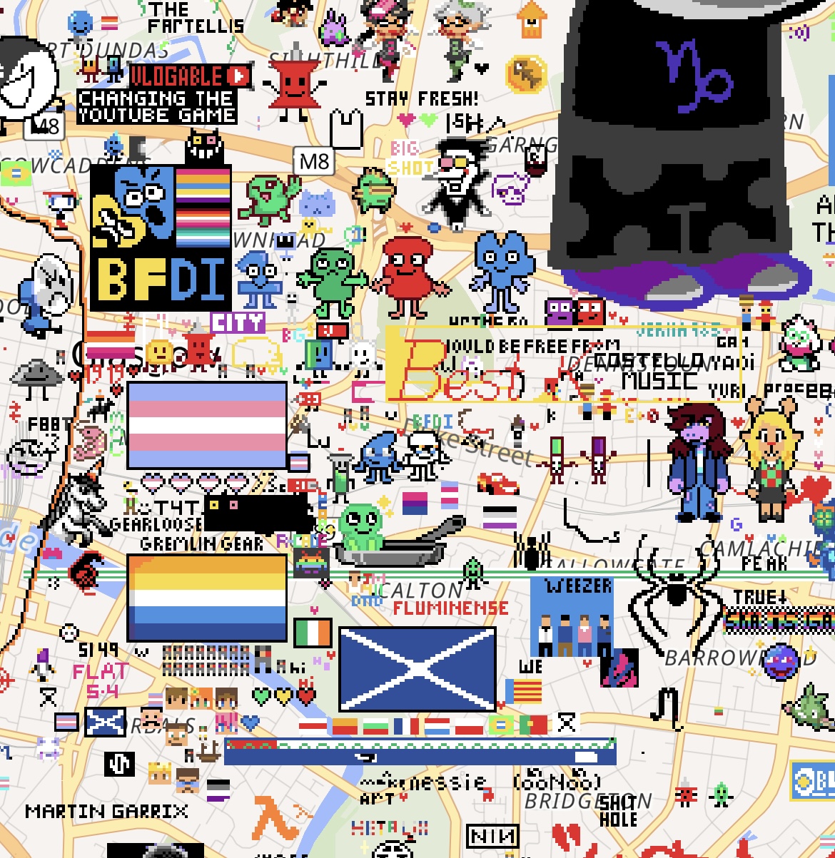from: Anonymous@202 I DONT KNOW HOW TO GET COORDS. GLASGOW CENTRAL. EAST OF HOMESTUCK. IMMEDIATELY WEST OF BABYTRON. GODSPEED.
